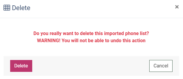 To delete the imported phone number list, click the “Delete” button in the “Actions” column, and confirm the action by clicking the “Delete” button in the “Delete” pop-up window.
