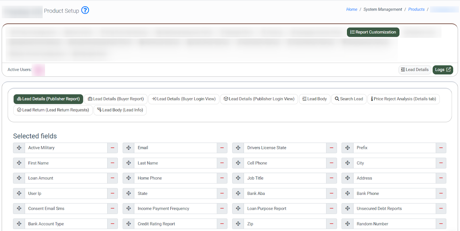 - Lead Details (Publisher Login View): The sub-tab allows you to add and configure the Publisher Lead Details report fields for non-employee user groups with limited access. Note: The report data is available for the Publisher system role. To access the corresponding report, go to the All Reports > Buyer Reports > Lead Details section.