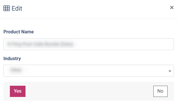 To rename or change the Industry for the Product, click the “Edit” button in the “Actions” column, enter the new name into the “Product Name” field, or select the Industry from the drop-down list, and click the “Yes” button to complete the action.