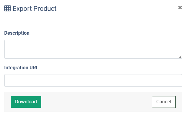 To export the configurations of the custom Product from the system, click the “Export” button in the “Actions” column, add a description and integration URL to the appropriate fields, and click the “Download” button to complete the action.