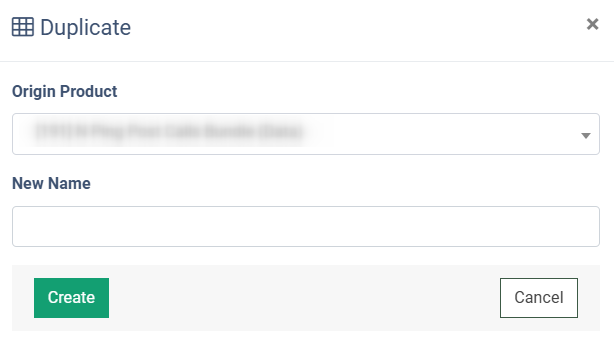 To duplicate the custom Product, click the “Duplicate” button in the “Actions” column, select the Product you want to duplicate from the “Origin Product” field, and enter the name of the new Product.