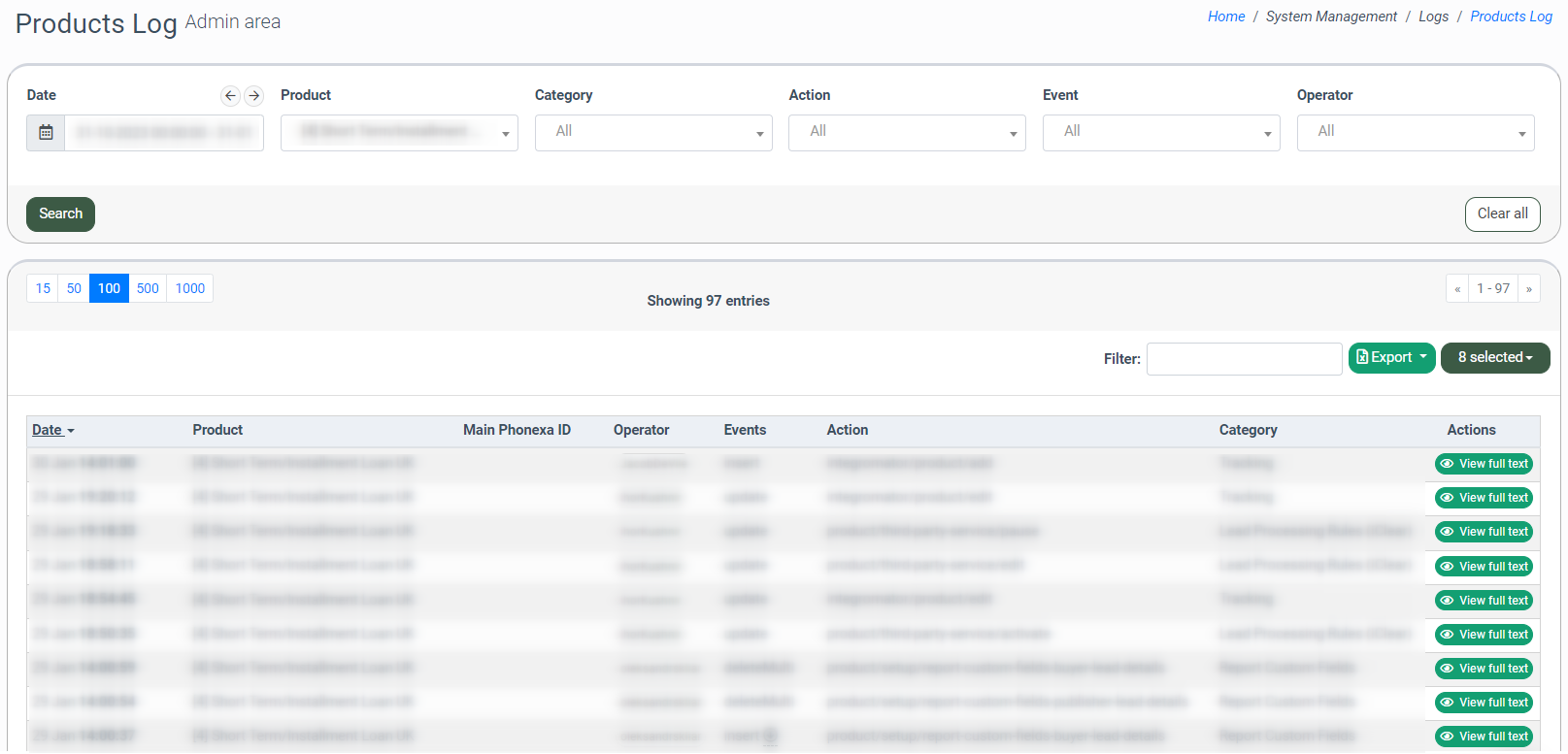 To view the detailed information about the Products Log, click the “View full text” button in the “Actions” column.