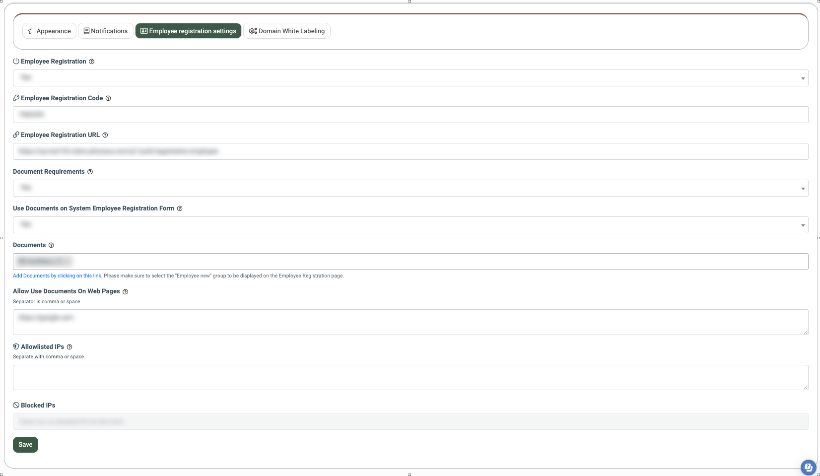 - Blocked IPs: Enter the IP addresses that should be blocked from accessing the employee registration form.
