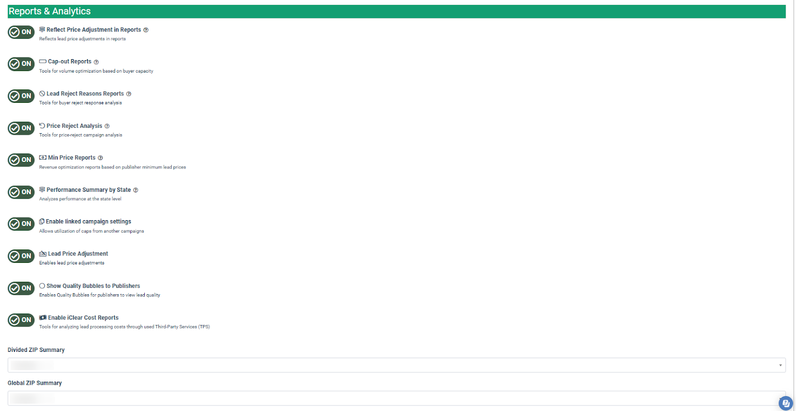 Note: All reports under this feature will provide a look at a campaign’s caps by date, and if the caps were met. - Lead Reject Reasons Reports: Switch the toggle to the “On” position to enable the Lead Reject Reasons reports.
