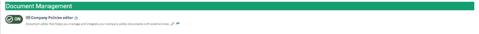 - Company Policies editor: Switch the toggle to the “On” position to enable the Company Policies editor feature.