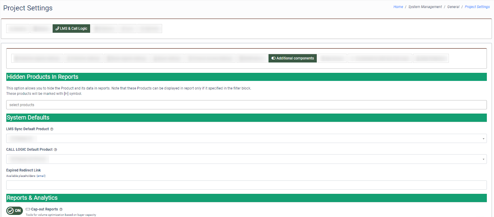 The “Additional Components” tab in the Project Settings > LMS & Call Logic allows you to set up the system's default Products, enable the hidden reports, and provides you with additional Publisher and Buyer Tools.