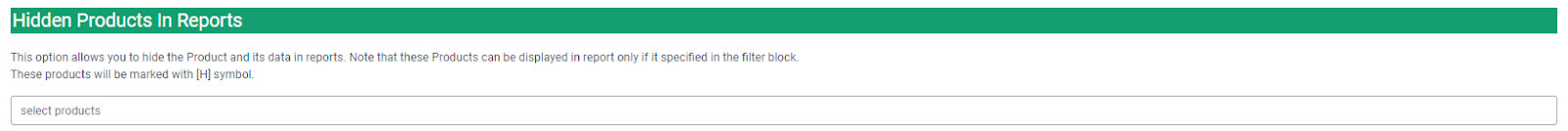 The “Hidden Products in Reports” block allows you to hide displaying the Product and its data in reports. Note: Hidden Products can be displayed in the reports only if it’s specified in the filter block. These products will be marked with the [H] symbol.