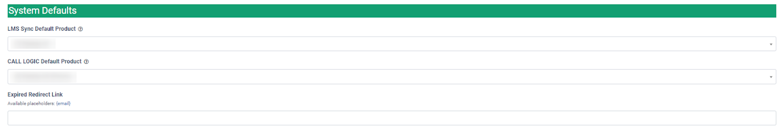 The “System Defaults” block allows you to set up the default products for LMS & Call Logic components and set up the expired redirect link. The “System Defaults” block contains the following fields: