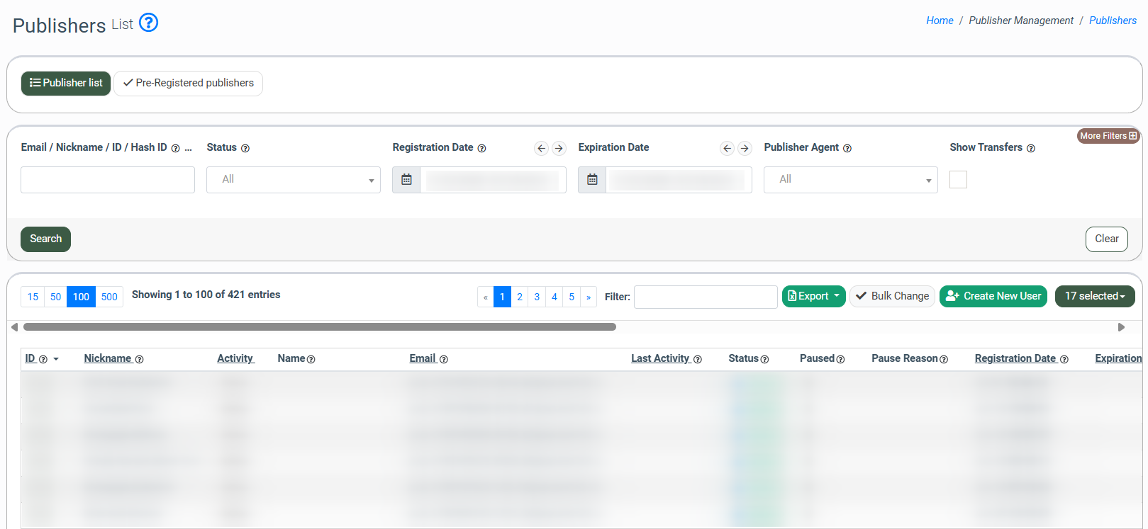 To manage a few pre-registered publishers simultaneously, go to the “Pre-Registered Publishers” tab, click the “Bulk Change” button, and check the boxes of the Pre-Registered Publishers you want to change.