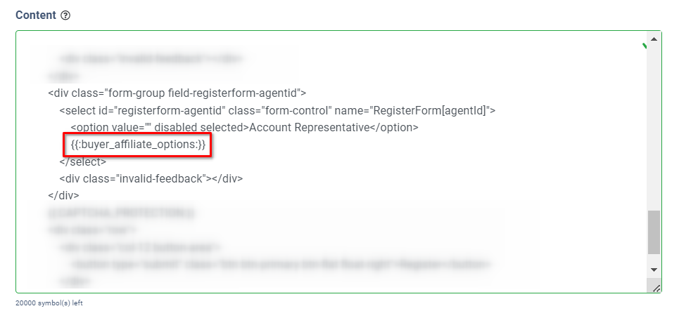 - Buyer Affiliate Options Placeholder: Check the box to enable the options for the Account Representative selection for the Buyer registration. Note, that you should put the placeholder to the needed position in the “Content” field.
