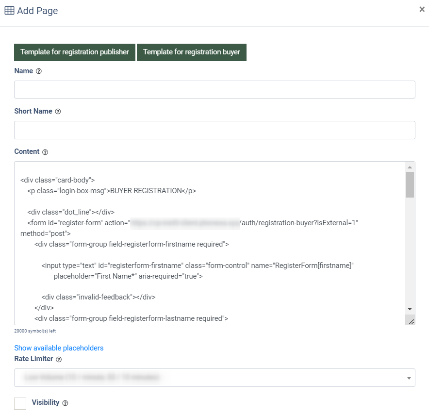 - Publisher Affiliate Options Placeholder: Check the box to enable the options for the Account Representative selection for the Publisher registration. Note, that you should put the placeholder to the needed position in the “Content” field.