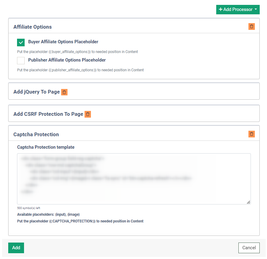 To prefill the page with the recommended script and page processors, click the “Template for registration buyer” button. The following field will be prefilled: