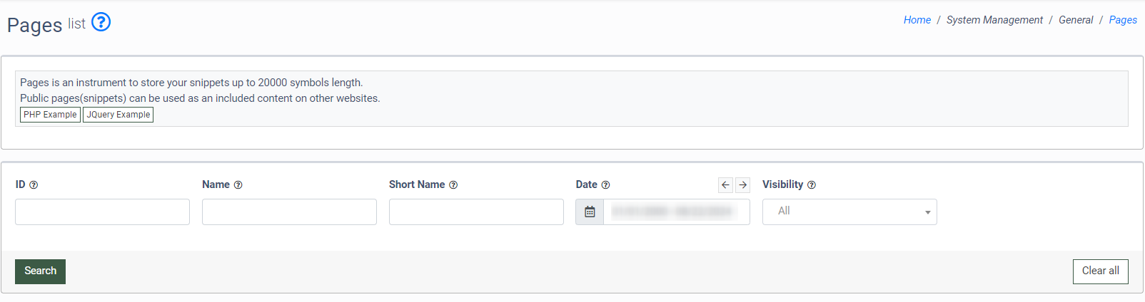 To create the Page, go to the System Management > General > Pages section, and click the “Add Page” button. Fill in the following fields in the "Add Page" pop-up window: