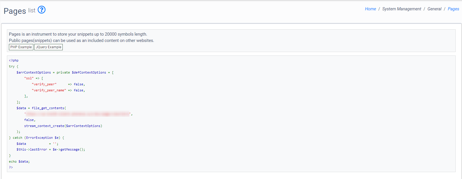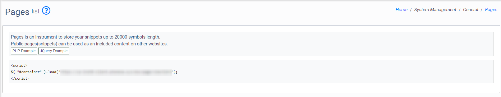 To place the registration form on the customer’s website, click the “PHP Example” or “JQuery Example” button at the top of the “Pages” section. You can view the sample code that should be placed on your website to implement the registration form.