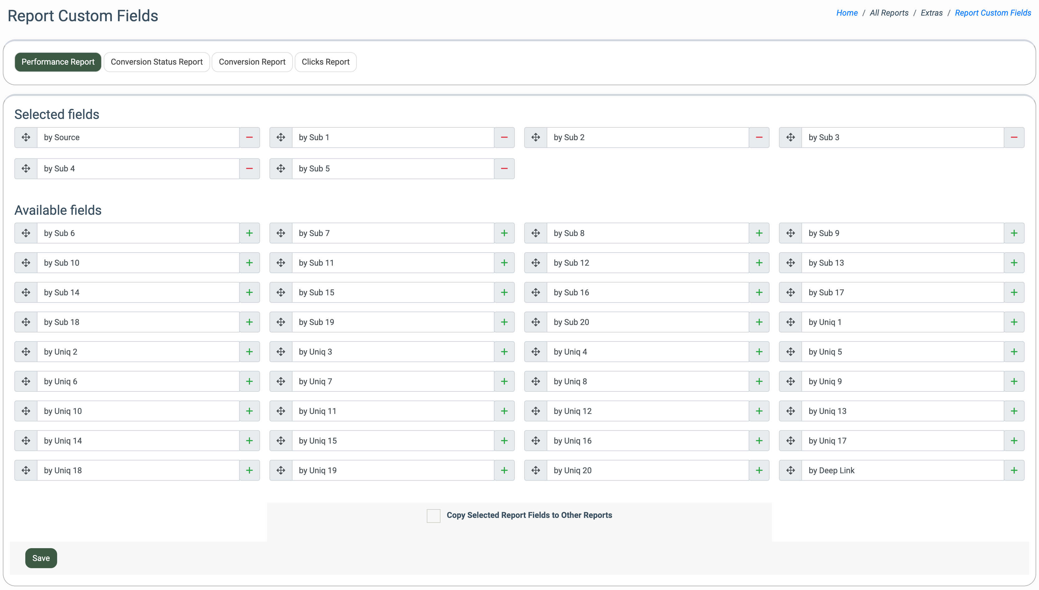 The Report Custom Fields section lets you add custom columns and filters to the Performance, Conversion Status, Conversion, and Clicks reports, providing more detailed and convenient analytics based on existing data.