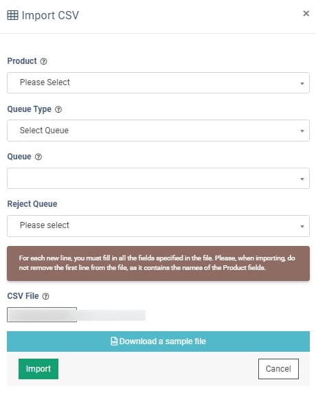 - Queue Type: Select the “New Queue” option to create a new queue for the leads in the CSV or the “Select Queue” option to add the leads in the CSV to an existing queue.