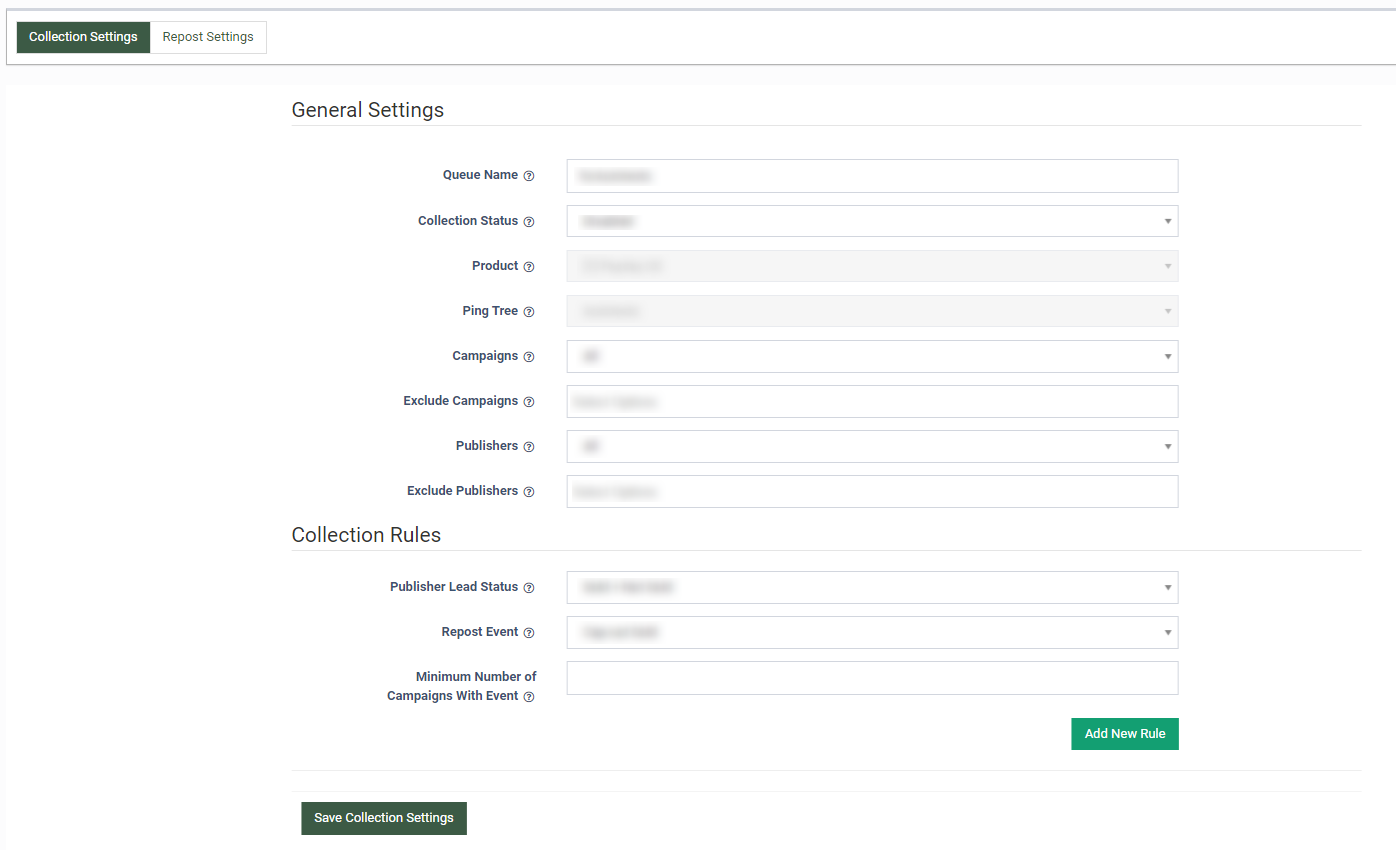 The Repost Queue Settings page allows you to configure Collection Settings which define how leads are collected for the repost, and Repost Settings which define the reposting strategy for the collected leads.