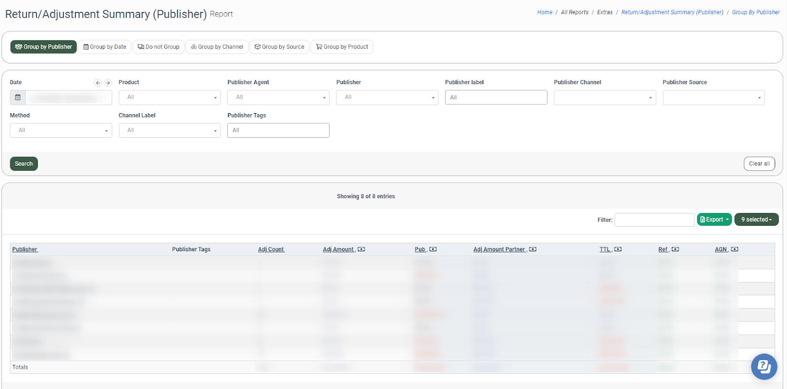 The “Return/Adjustment Summary (Publisher)” report allows you to analyze returns by source to evaluate the effectiveness of various sources.
