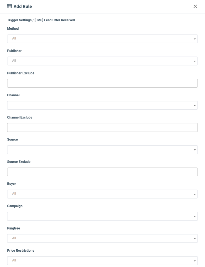 - Price Restrictions: Select the Price restrictions (Price is greater than 0, Price is greater than a certain value, Price is greater than or equal to a certain value, Price is lower than a certain value, Price is lower than or equal to a certain value, Price range inclusive). Note: The “Price range inclusive” value is available only for the “Lead Sold” and “Campaign Sold” triggers.