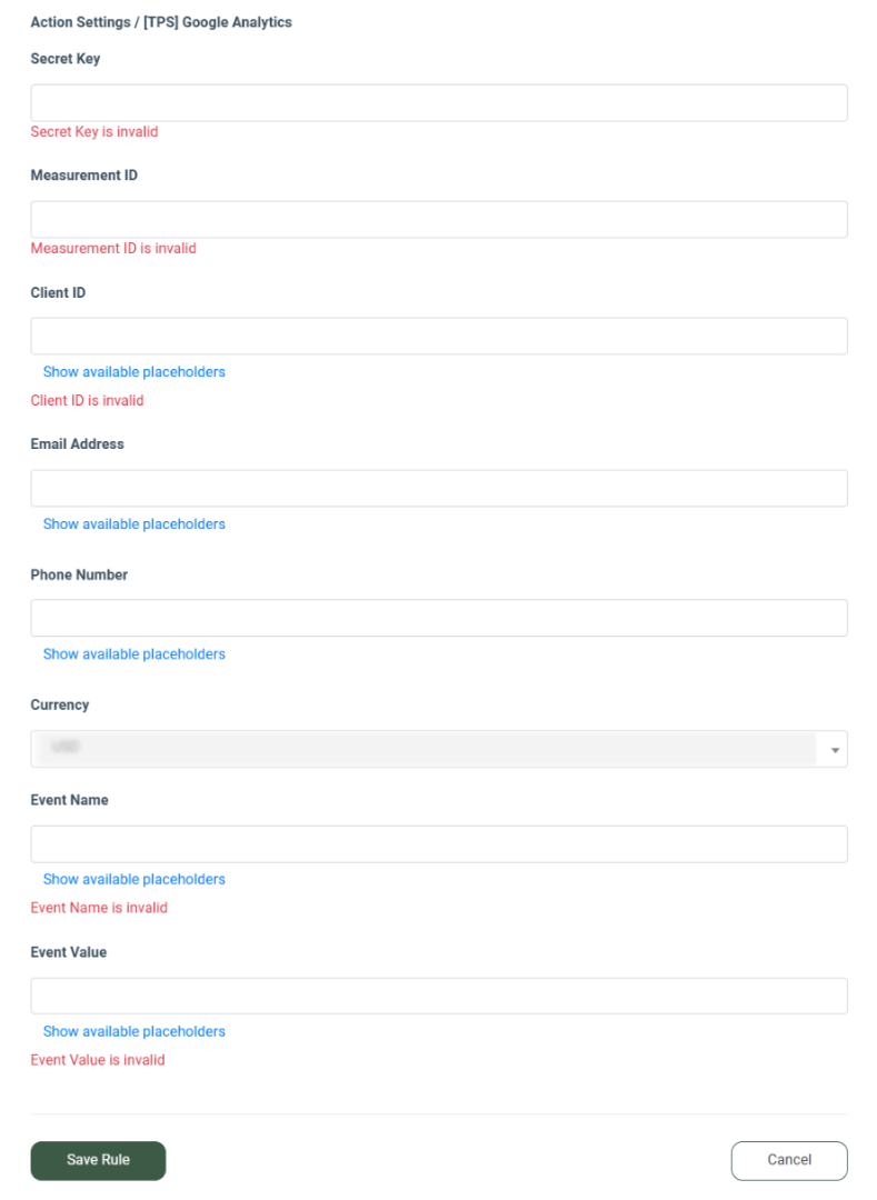 This value should be entered in the “Secret Key” field in the “Action Settings / Google Analytics” block on the “Add Rule” pop-up window.