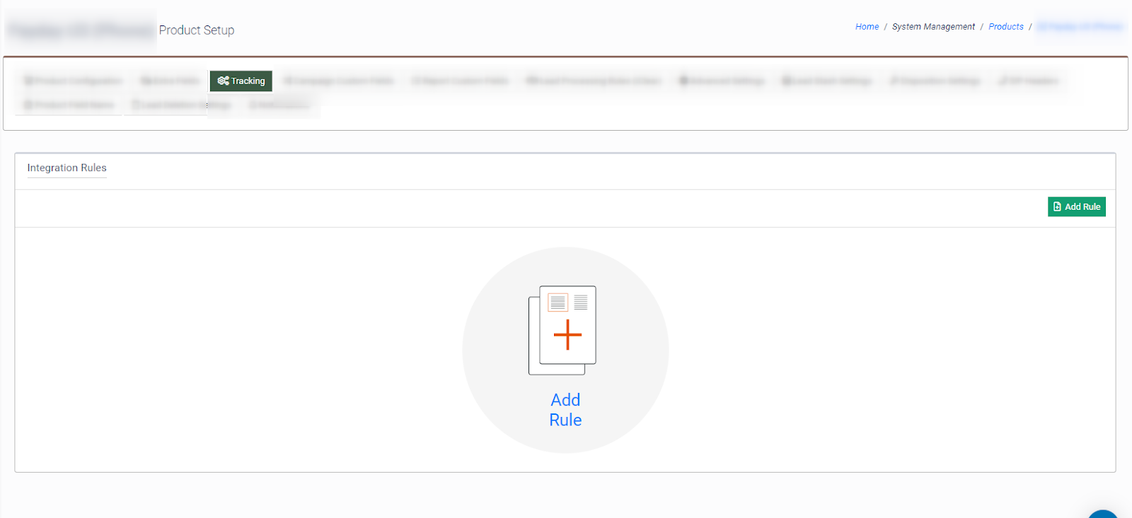 To add the event tracking rule, select the “Tracking” tab in the Product Setup section and click the “Add Rule” button.