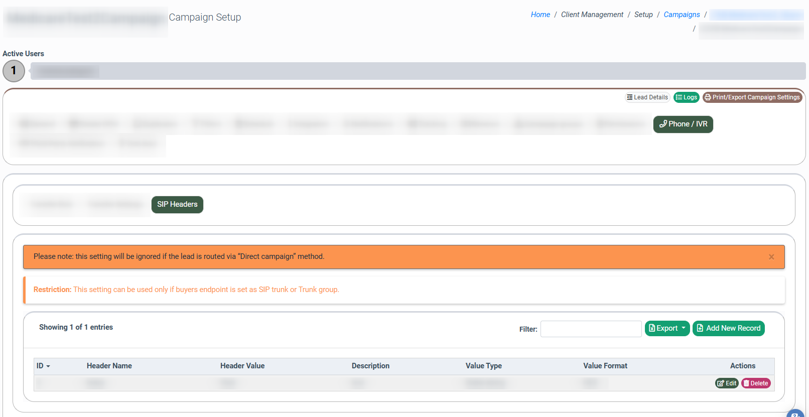 To set up or edit the SIP Headers feature for the Campaign, go to the Client Management > Campaigns section, click the “Configure” button, and select the “Phone/IVR” tab, click the "SIP Headers" subtab.