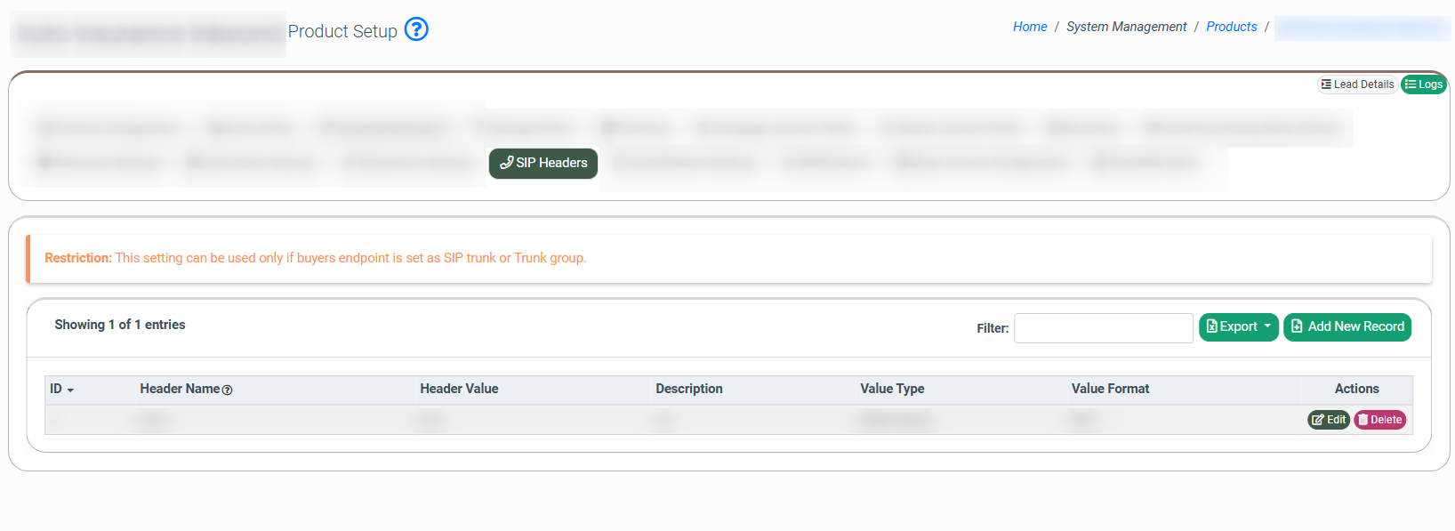 To set up or edit the SIP Headers feature for the Product, go to the System Management > Products section, click the “Settings” button, and select the “SIP Headers” tab.