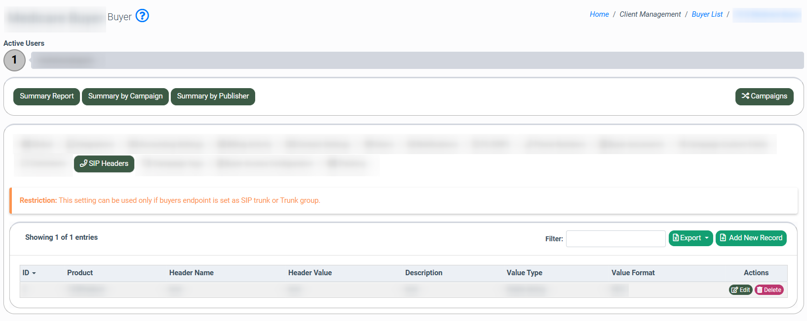 To set up or edit the SIP Headers feature for the Buyer, go to the Client Management > Buyer List section, click the “Settings” button and select the “SIP Headers” tab.