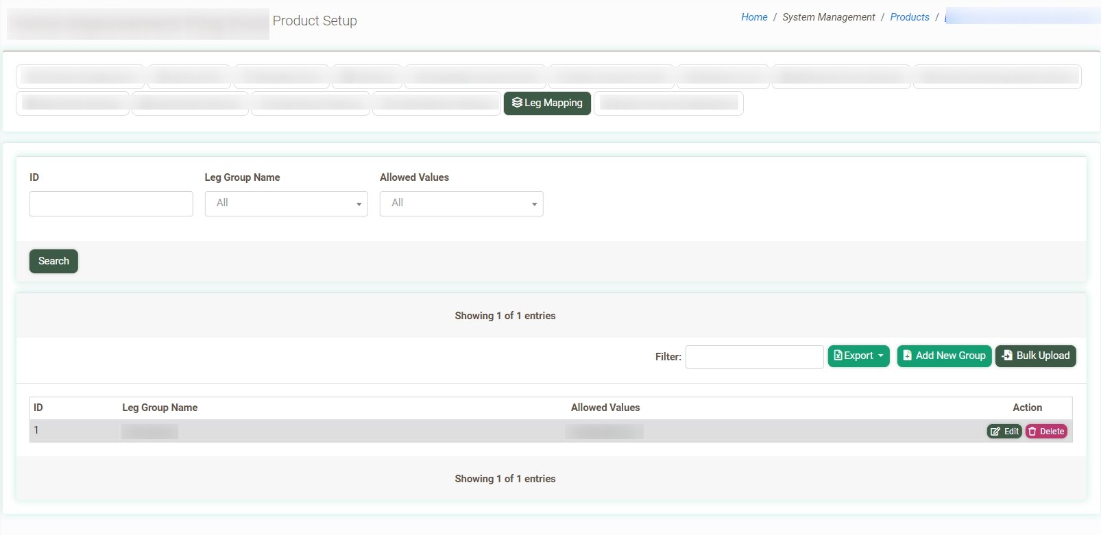 To manage the filter settings, go to the System Management > Products section, select the Product, click the “Settings” button, and navigate to the “Leg Mapping” tab.