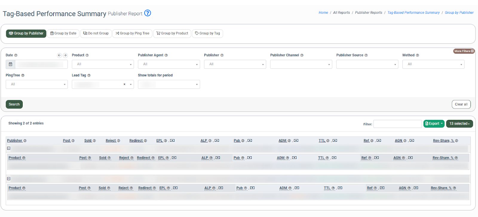 The “Group by Publisher” tab allows you to see publisher performance for the selected tag. Additionally, you can view the summary data grouped by the specific Product.