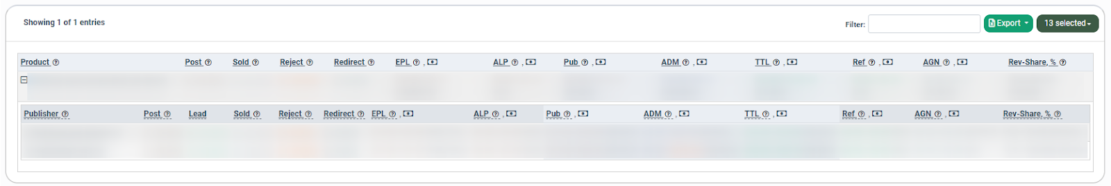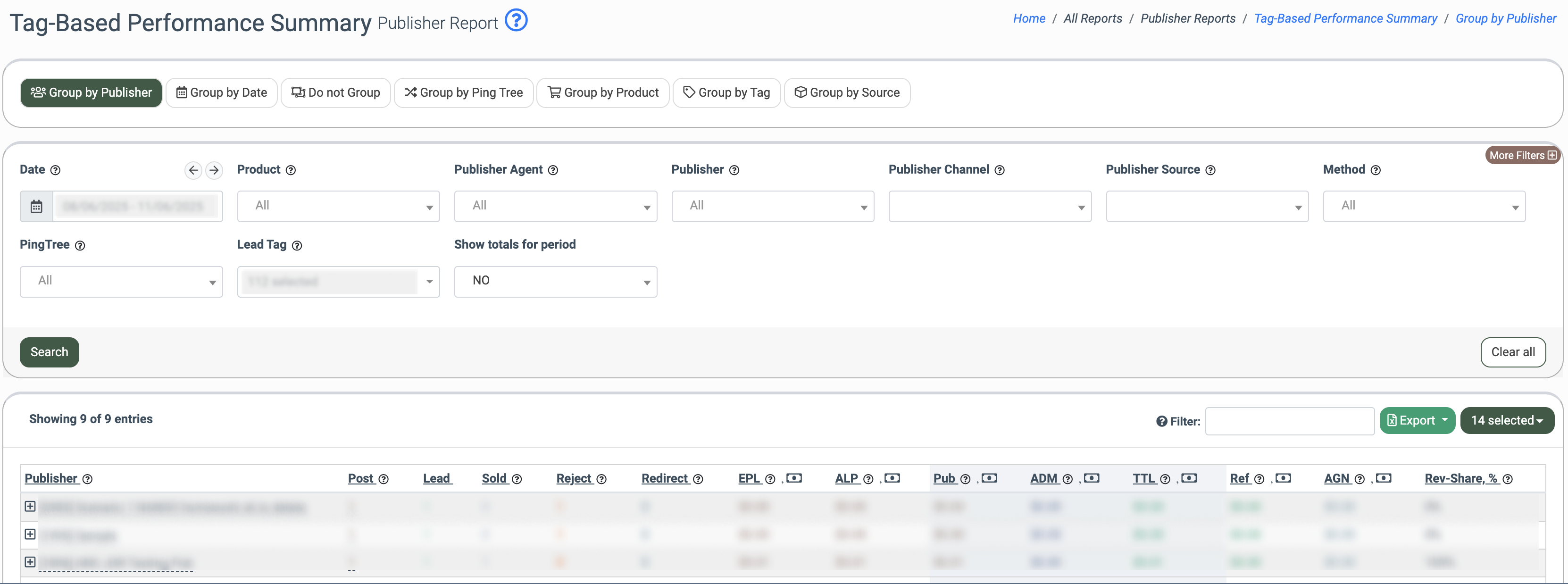 To view the additional information about the lead processing for the particular Publisher that is grouped by the particular Products, select the “Group by Publisher” tab and click the “+” button in the “Publisher” field. The summary details that are grouped by Product and by the particular selected tag will be displayed in the following collapsible section.