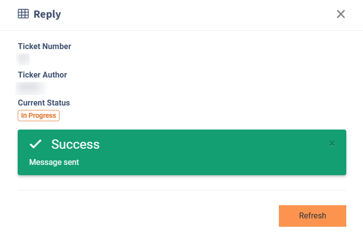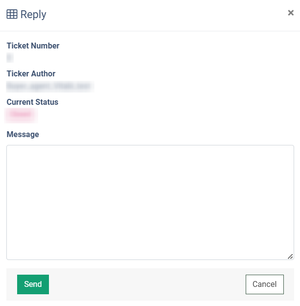 To leave a new reply on the ongoing ticket, click the “Reply” button, fill in the reply text in the “Message” field of the “Reply” pop-up window, and click the “Send” button to complete the action.