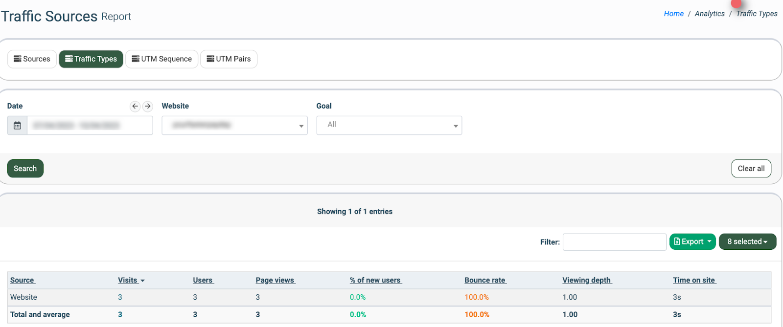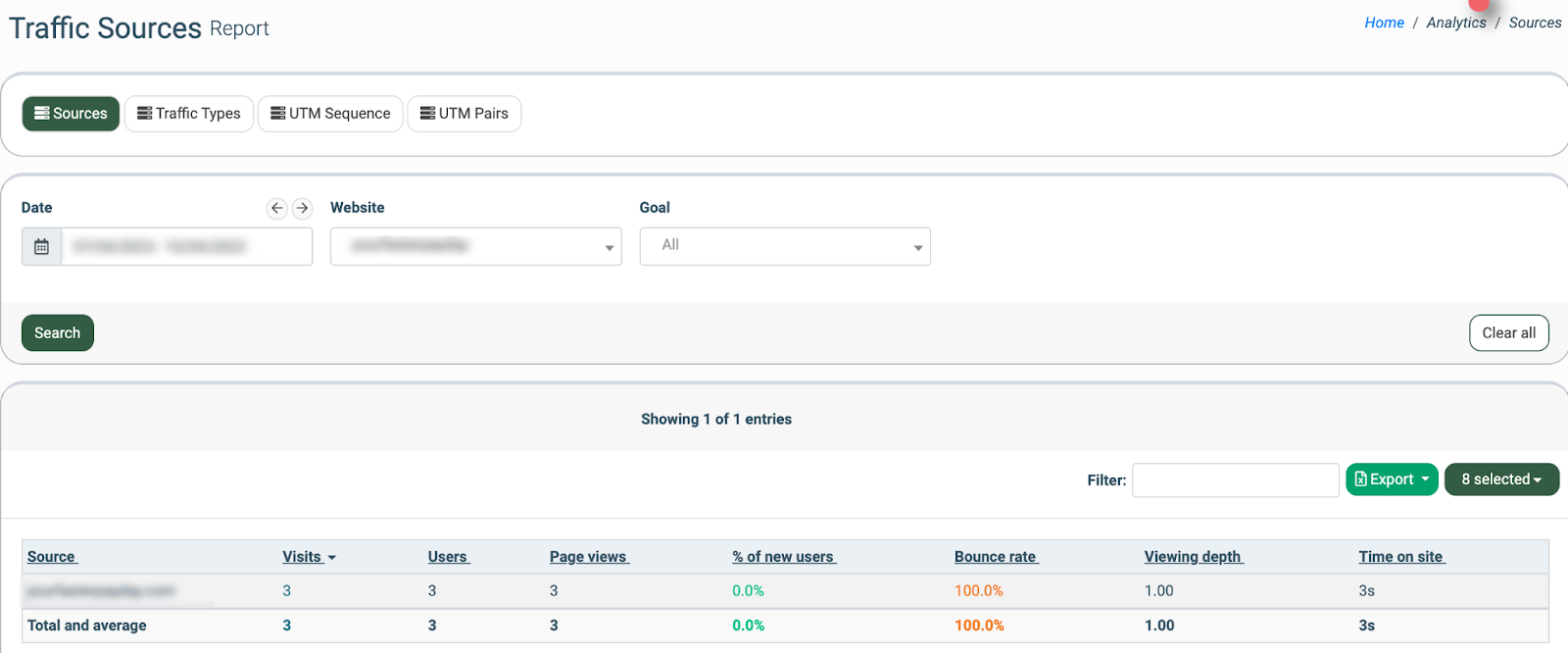 The Traffic Sources report allows you to view detailed information about the sources associated with specific domains, get traffic analytics grouped by the source type, and observe the sources using the Urchin Tracking Modules Sequences and Pairs.