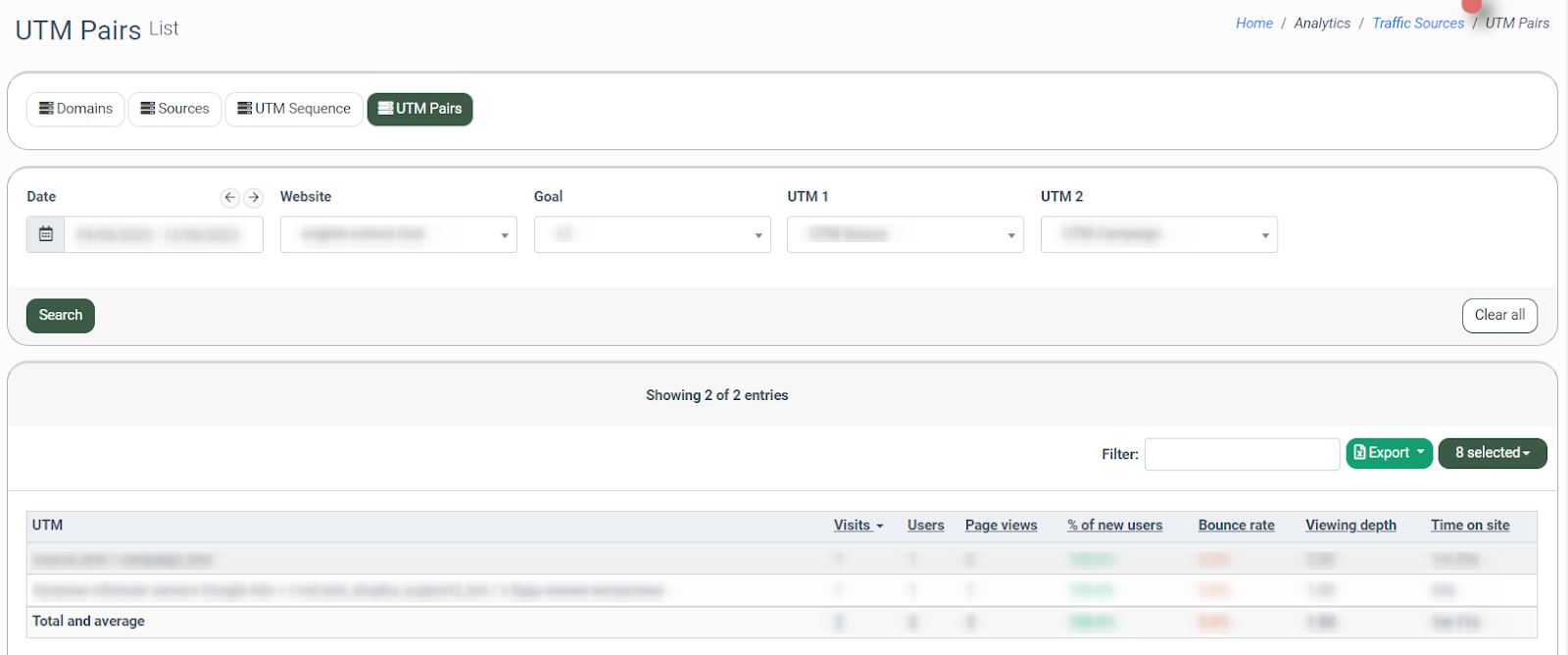 The UTM Pairs tab allows you to view detailed reports for the traffic source using two UTM filters.