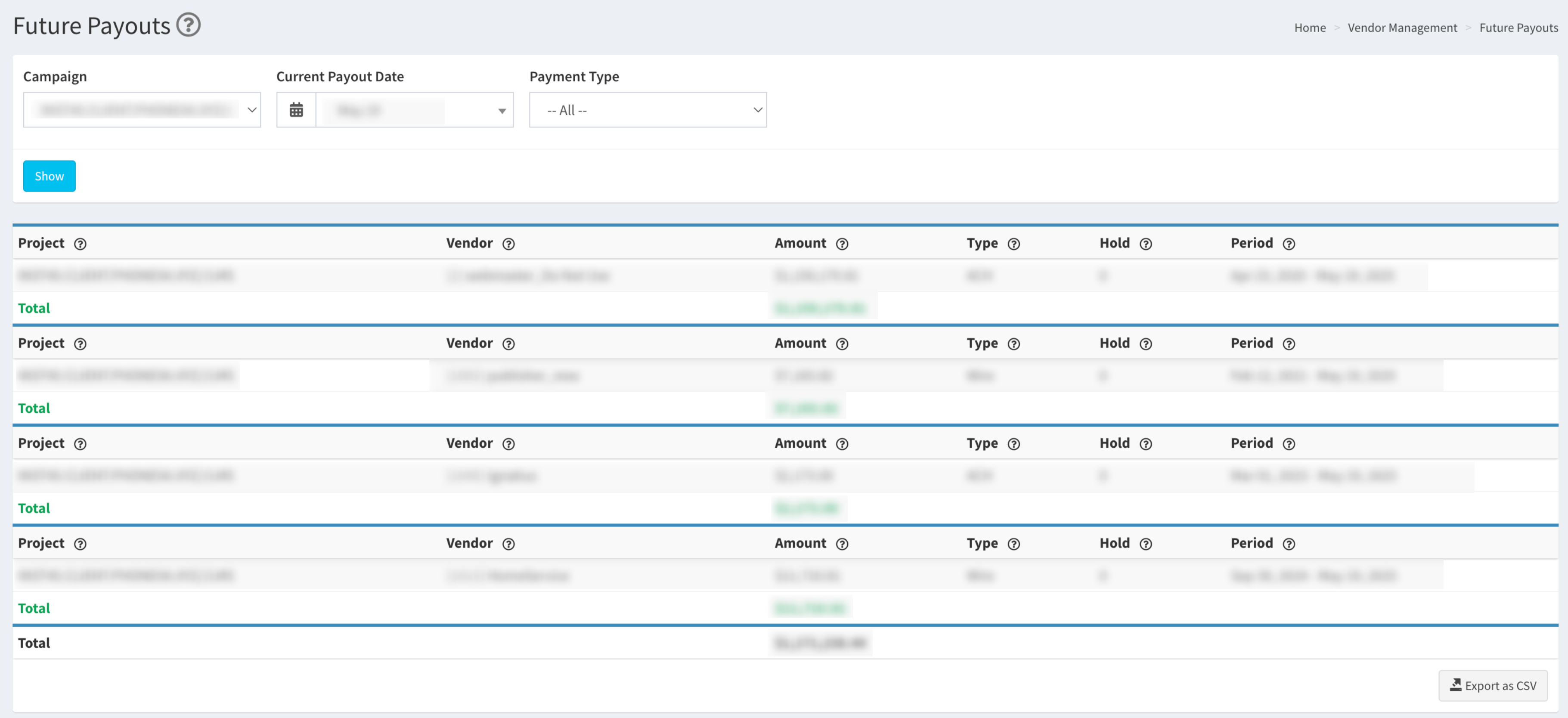 The Future Payouts section displays all upcoming payouts scheduled for the next payout dates.