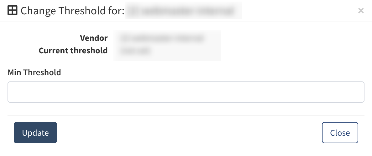 - Threshold: The threshold amount set for the Vendor’s payout processing. To set the Vendor’s minimum threshold payout amount, click the button in the corresponding column. Enter the amount into the “Min Threshold” field and click the “Update” button.