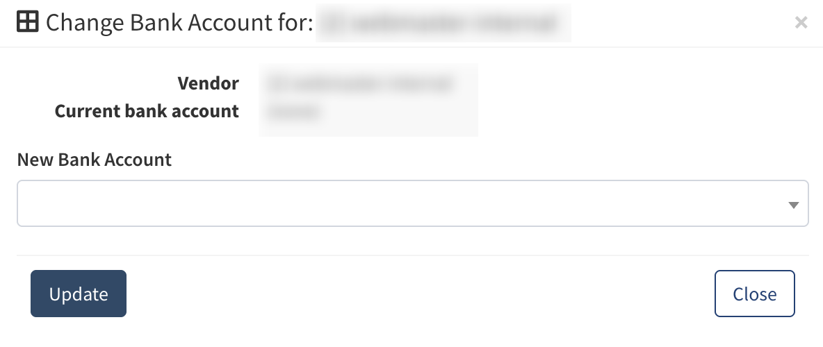 - Bank: The Vendor’s bank account. To change the Vendor’s bank account, click the value in the corresponding column. Make a selection in the “New Bank Account” field and click the “Update” button.