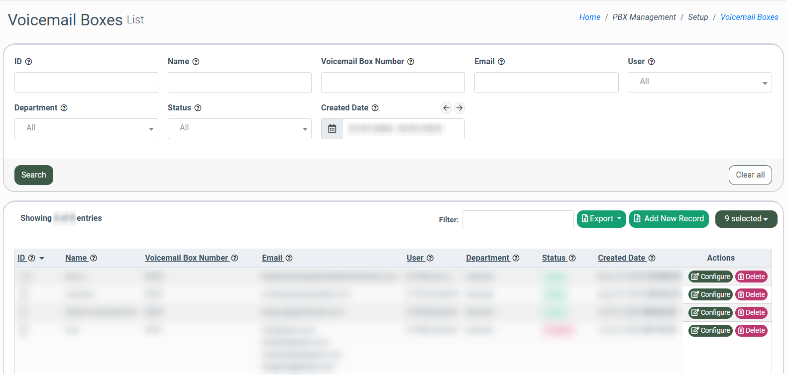To add a new voicemail box, click the “Add New Record” button. In the “Add New” pop-up window fill in the following fields: