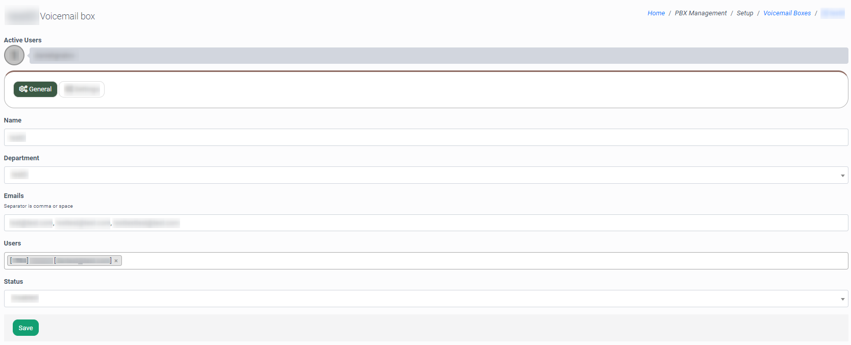 - Status: Select the status of the voicemail box (Active, Disabled).