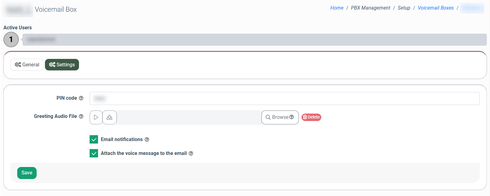 The “General” tab allows you to edit the general settings of the Voicemail box.