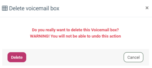 To delete the voicemail box, click the “Delete” button in the “Actions” column. In the “Delete voicemail box” pop-up window, click the “Delete” button to confirm the action, or click the “Cancel” button to close the window. Note: Once the Voicemail box is deleted, the voicemail messages from it are stored in the Voicemail Summary report.