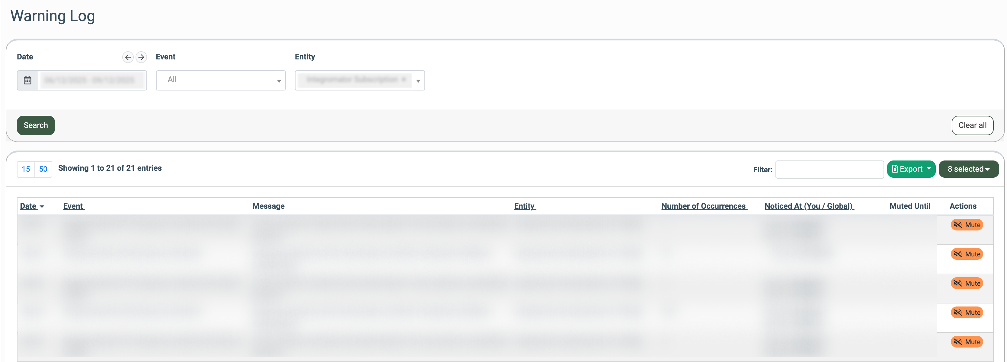To mute a warning for a specific event and entity, select the record from the list and click the “Mute” button in the “Actions” column. Fill in the following information: