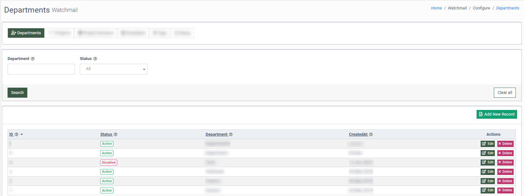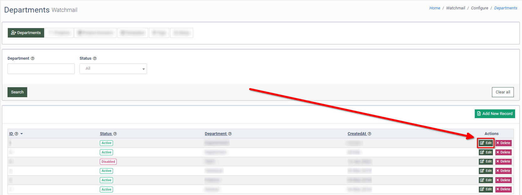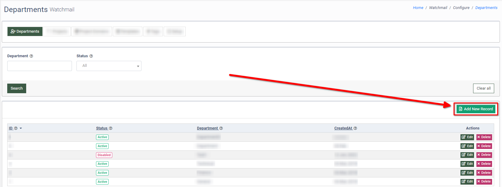 To add a new department to the list, click the “Add New Record” button.