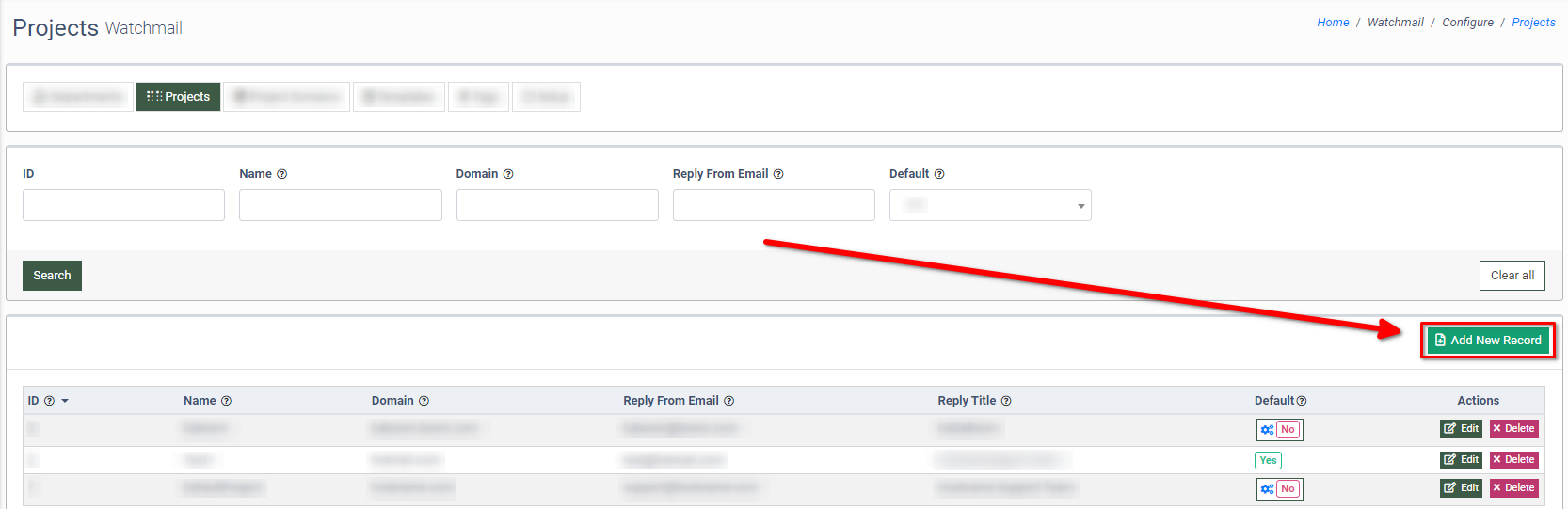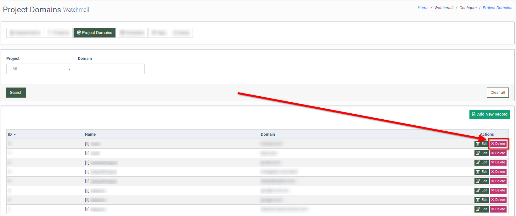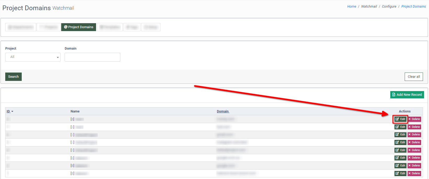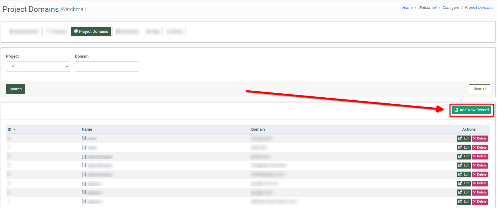 To add a new domain to the Project, click the “Add New Record” button.