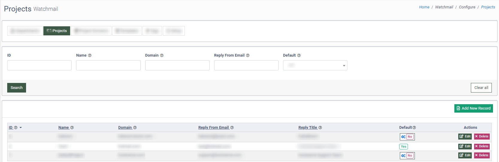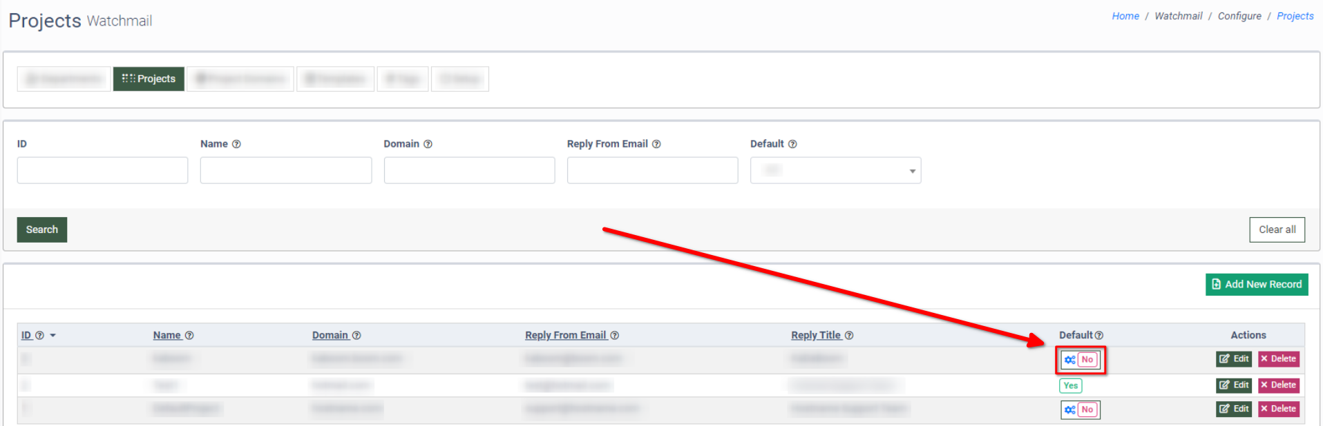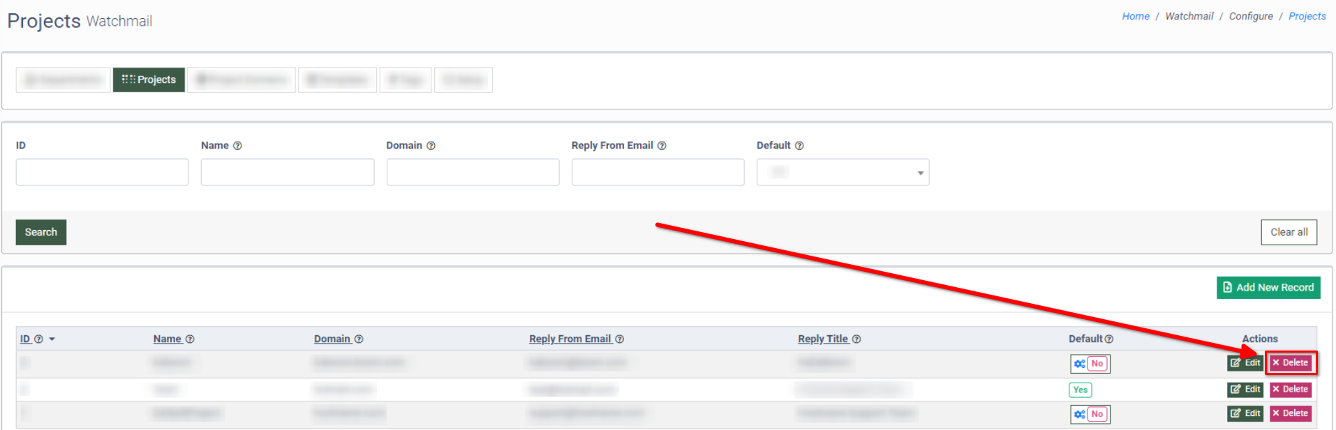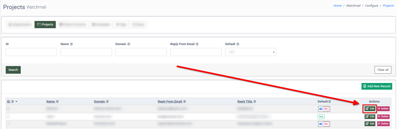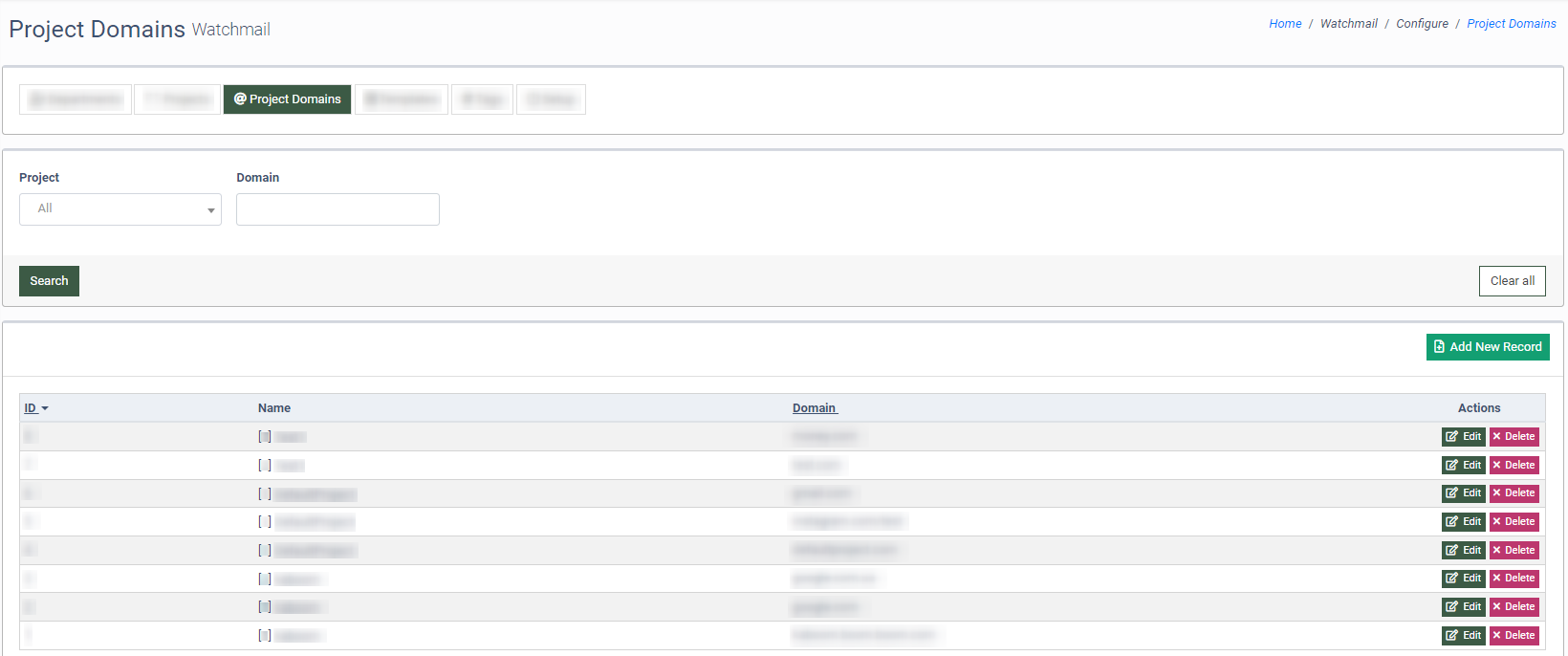 To add a new domain to the Project, click the “Add New Record” button.