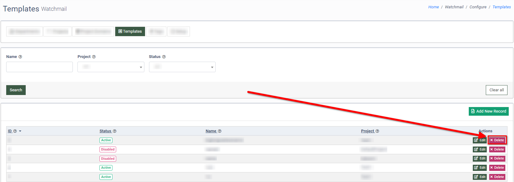 To delete the Project, click the “Delete” button in the “Actions” column.