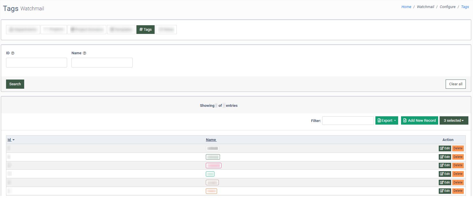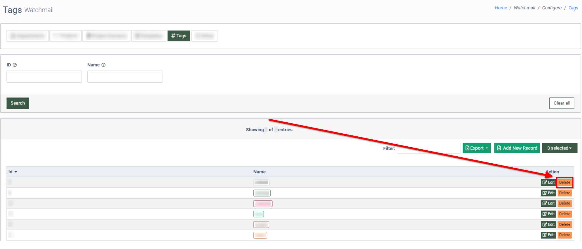 To remove the tag from the list, click the “Delete” button in the “Actions” column.