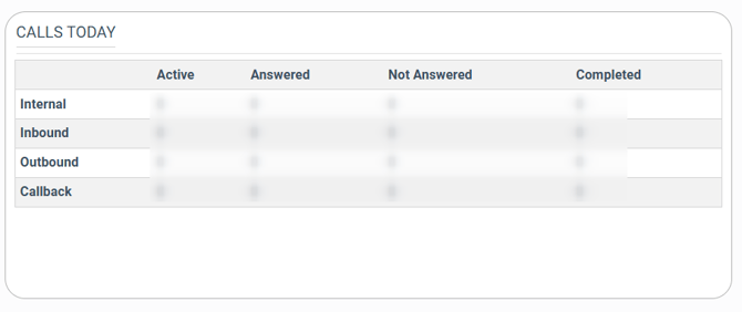The “Calls Today” block contains summary details about the calls processed for the current date. The information is grouped by the call type according to the destination (Internal, Inbound, Outbound).