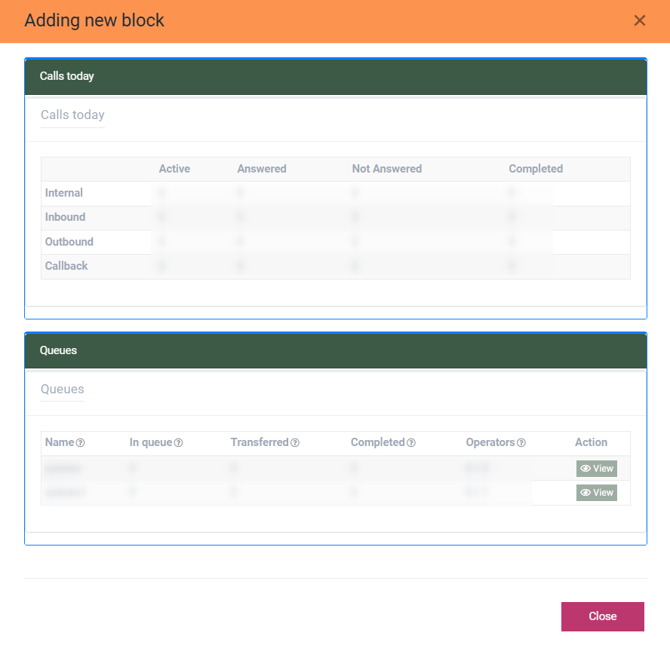 To add a new block to the dashboard, click the “Add new block” button, then select the block that should be added to the dashboard in the “Adding new block” pop-up window.