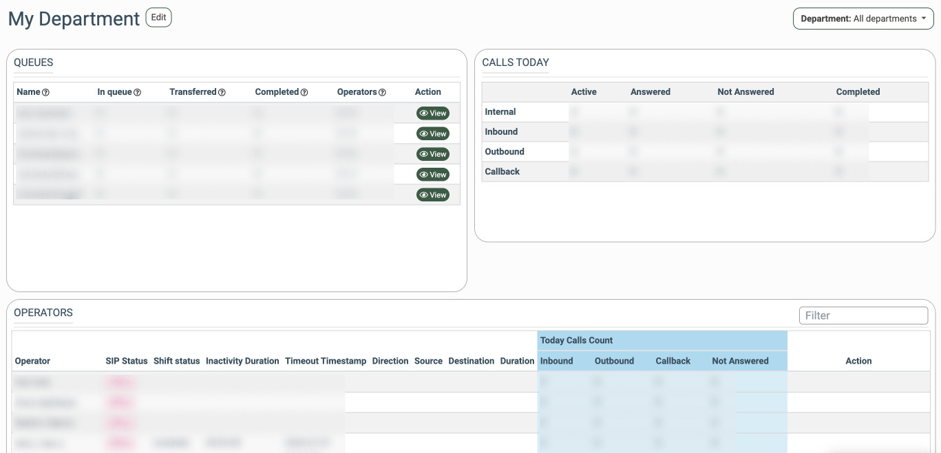 - Operators: The number of operators attached to the particular queue (total number of operators/the number of operators that are currently online). Note that there will be no operator and queue if they are not assigned to the corresponding department.